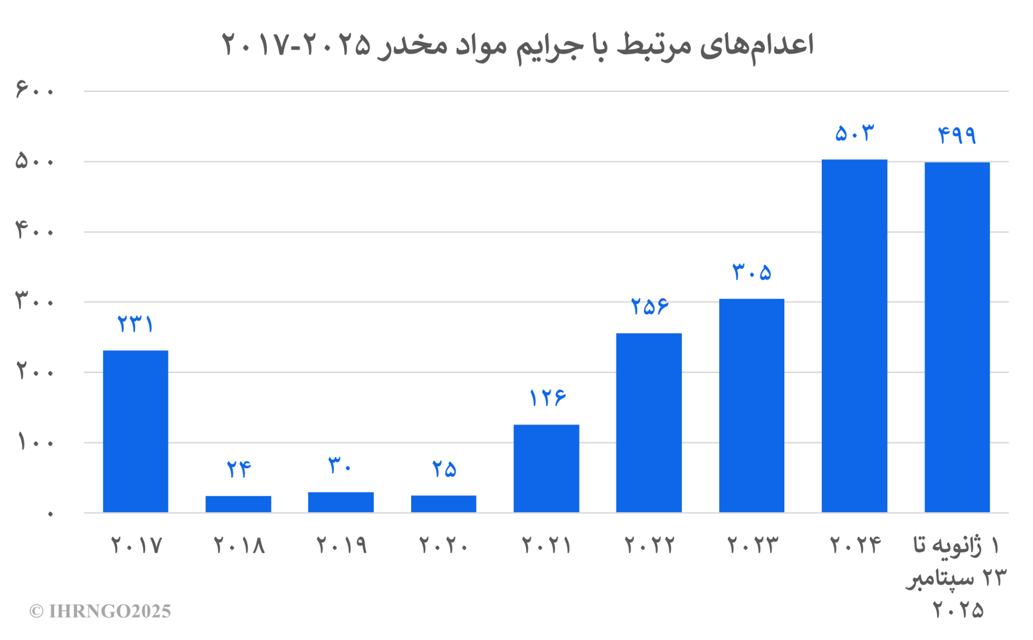 بر اساس گزارشهای سازمان حقوقبشر ایران از اول سال جاری میلادی تا ۲۳ سپتامبر دستکم ۴۹۹ نفر با اتهامات مربوط به «مواد مخدر» در زندانهای مختلف تمام استانهای ایران اعدام شدند.