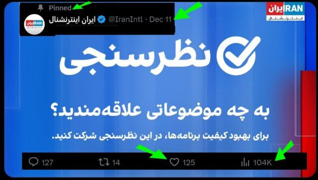 پنجم علیرغم اینکه رأیگیری برای مدت حداقل پنج روز در بالای صفحه اول ایکس تلویزیون ایران اینترنشنال الصاق دائمی (Pinned) شده است، فقط ۱۲۵ نفر آن را لایک کردهاند؟