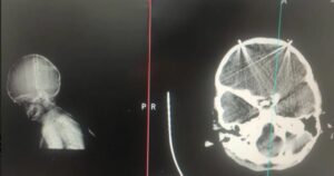 در تصاویر همچنین دو ساچمه روی لبههای ناحیه فونتانل هستند. این ساچمهها چه خطری را متوجه نوزاد می کنند؟ این فعال کادر درمان پاسخ میدهد: «چون در آن قسمت جمجمه، استخوان هنوز شکل نگرفته است و در حال تکمیل است، پردهٔ مغزی بسیار نازکی در آنجا قرار دارد که ساچمه میتواند به راحتی داخل بافت مغز وارد شده و به عفونت منجر شود. از سوی دیگر امکان دارد وجود ساچمه در آن ناحیه به خونریزی و سکته مغزی منجر شود. در کمال تأسف با عکسهایی که میبینم این آسیبها میتوانند به مرگ، نابینایی یا ناتوانیهایی که تا آخر عمر همراه نوزاد باشند، منتهی شده و دستکم آیندهٔ او را تا آخر عمر تحت تأثیر قرار دهند.»