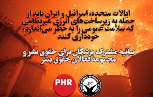 حملات ایالات متحده و اسرائیل به زیرساختهای انرژی ایران، از جمله پالایشگاههای نفت، تأسیسات فرآوری گاز و انبارهای سوخت، خطرات جدی برای سلامت و محیط زیست جمعیت غیرنظامی در ایران ایجاد میکند، پزشکان برای حقوق بشر و مجموعه فعالان حقوق بشر در ایران امروز هشدار دادند. همه طرفهای درگیر در این مناقشه باید حملات به زیرساختهای انرژی را که منجر به آسیب گسترده به سلامت عمومی میشود و نقض ممنوعیتهای حقوق بینالملل در خصوص حملاتی است که آسیب نامتناسب به غیرنظامیان وارد میکند، متوقف کنند.