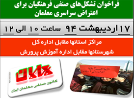 شورای مرکزی تشکل های صنفی فرهنگیان سراسر کشور با انتشار بیانیه ای، معلمان و فرهنگیان را به یک اعتراض سراسری در روز پنجشنبه ۱۷ اردیبهشت ماه دعوت کرد.