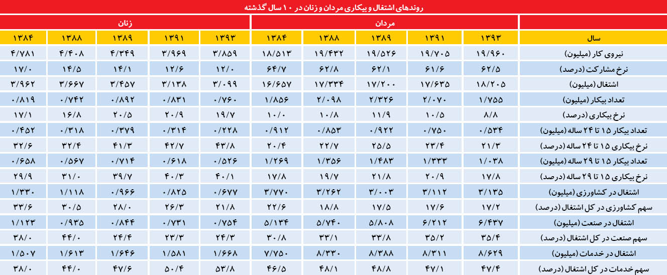 نگاهی به تعداد شغلهای ایجاد شده تعداد افراد بیکار ابعاد مساله را بیشتر روشن میکند. از ارقام جدول ۱ میتوان محاسبه کرد که در فاصله سالهای ۱۳۸۸ تا ۱۳۹۳ به طور خالص ۸۷۱ هزار شغل جدید برای مردان ایجاد شده؛ در حالی که اشتغال زنان ۵۶۸ هزار شغل کاهش داشته است. این روندها همراه بوده با خالص ورودی ۵۲۸ هزار مرد به بازار کار و خروج ۵۴۹ هزار زن از این بازار. در نتیجه، از تعداد بیکاران مرد ۳۴۳ هزار نفر کم شده و به تعداد بیکاران زن بیش از ۱۸ هزار نفر اضافه شده است. با این حساب مساله اشتغال و بیکاری در چند سال گذشته در واقع بیشتر مشکل زنان بوده است تا مشکل مردان.
