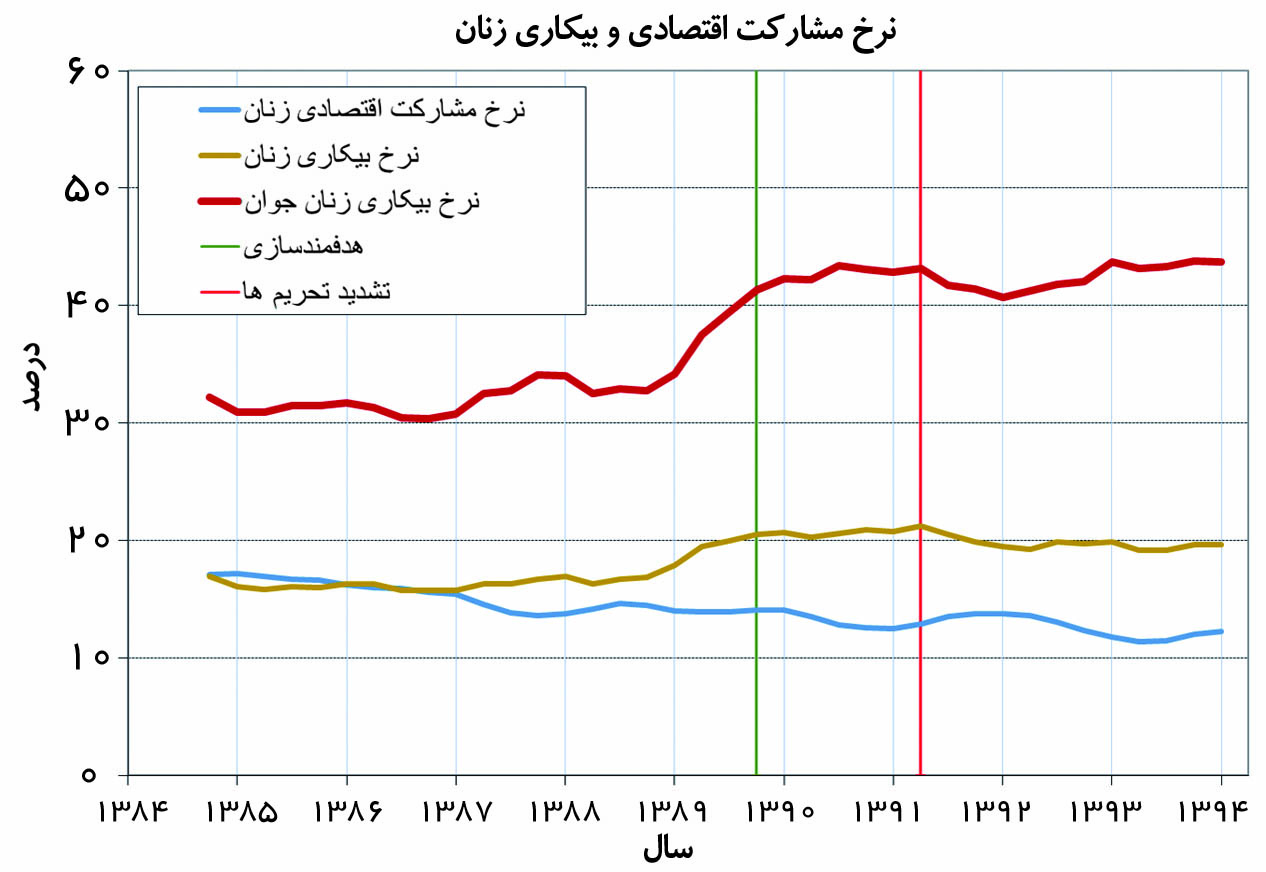 نمودارهای ۱ و ۲ و جدول ۱ روندهای چند جنبه مهم بازار کار ایران را در ۱۰ سال گذشته به طور مجزا برای زنان و مردان ترسیم میکنند. چشمگیرترین این روندها کاهش تدریجی نرخ مشارکت زنان در بازار کار و جهش نرخ بیکاری آنان در سال ۱۳۸۹ است. رشد شدید بیکاری بهخصوص در مورد زنان جوان که بسیاری از آنها تحصیلات متوسطه و بالاتر دارند، کاملا مشهود است. نکته قابل توجه این است که این روندها پیش از برنامه هدفمندسازی یارانهها و تشدید تحریمها شروع شده بودند و پس از تشدید تحریمها موقتا معکوس شدند، ولی بعد ادامه یافتند. کاهش نرخ مشارکت در دهه ۱۳۸۰ و رشد نرخ بیکاری در سال ۱۳۸۹ در مورد مردان هم صادق است. ولی برای مردان، بازار کار از سال ۱۳۹۱ به بعد روندهای کاملا متفاوتی در پیش گرفته است: نرخ مشارکت قدری بالا رفته و نرخ بیکاری پایین آمده است. در نتیجه، نرخ مشارکت زنان نسبت به مردان به حدود یک پنجم نزول کرده و نرخ بیکاری زنان به بیش از دو برابر نرخ بیکاری مردان رسیده است.