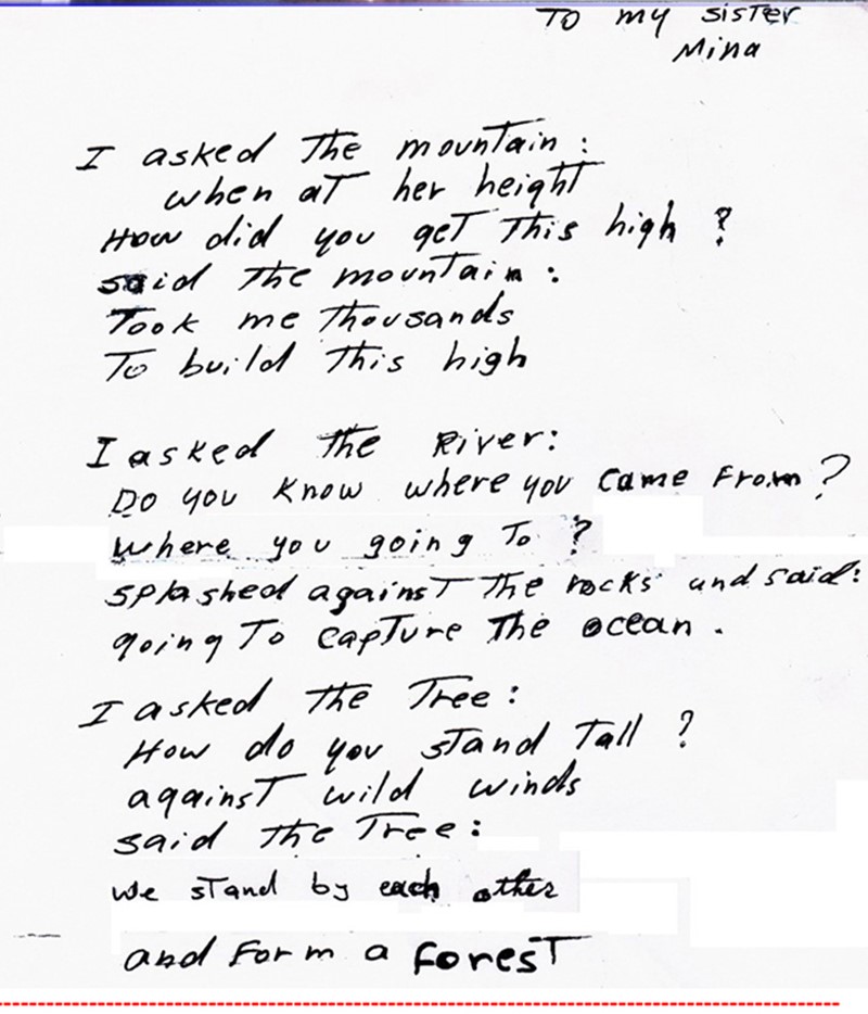 ۱– تصویر سروده زیبایی که برادر عزیزم محسن در تابستان سال ۱۳۶۵ موقعی که در زندان بودم در دفتر یاداشتی برایم نوشته بود و سال ۶۷ آن را بدست خودم داد. برگردان این سروده به فارسی که توسط دوست گرامی، ناصر مهاجر انجام گرفته چنین است: