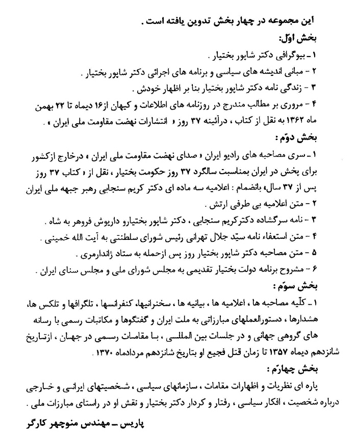 اين کتاب به همت مهندس منوچهر کارگر جمع آوری شده است و فهرست آن در زير درج ميشود: